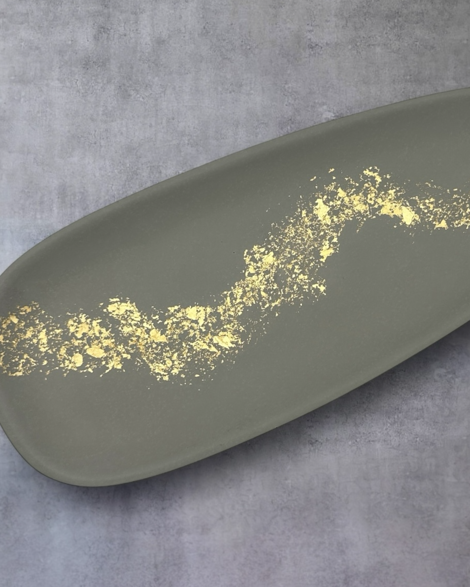 Luxury elongated tray with gold accents, handcrafted in Switzerland. The Shoreline tray features a sleek, elongated silhouette that offers generous space for styling. Perfect for candles, perfumes, stationery, or even coffee service, its matte, stone-like surface is elevated by hand-applied gold leaf — adding a refined shimmer without losing its quiet elegance. Both functional and artistic, Shoreline is a modern statement piece designed to bring understated luxury into minimal interiors.